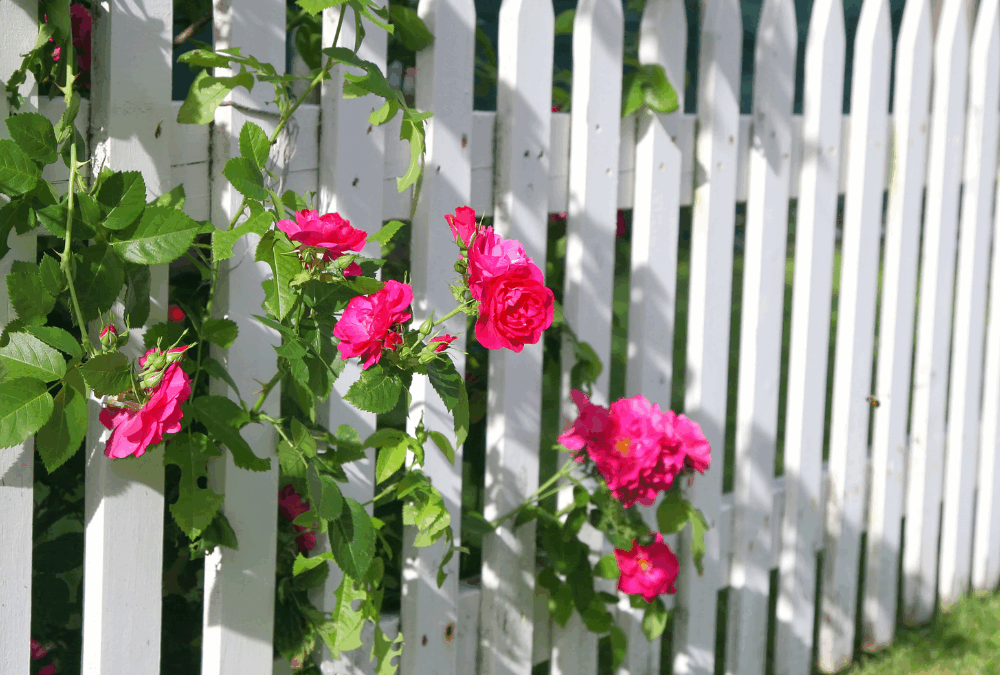 A classic white picket fence partially covered in bright pink climbing roses. Conveys the idea of healthy boundaries that support growth and beauty.